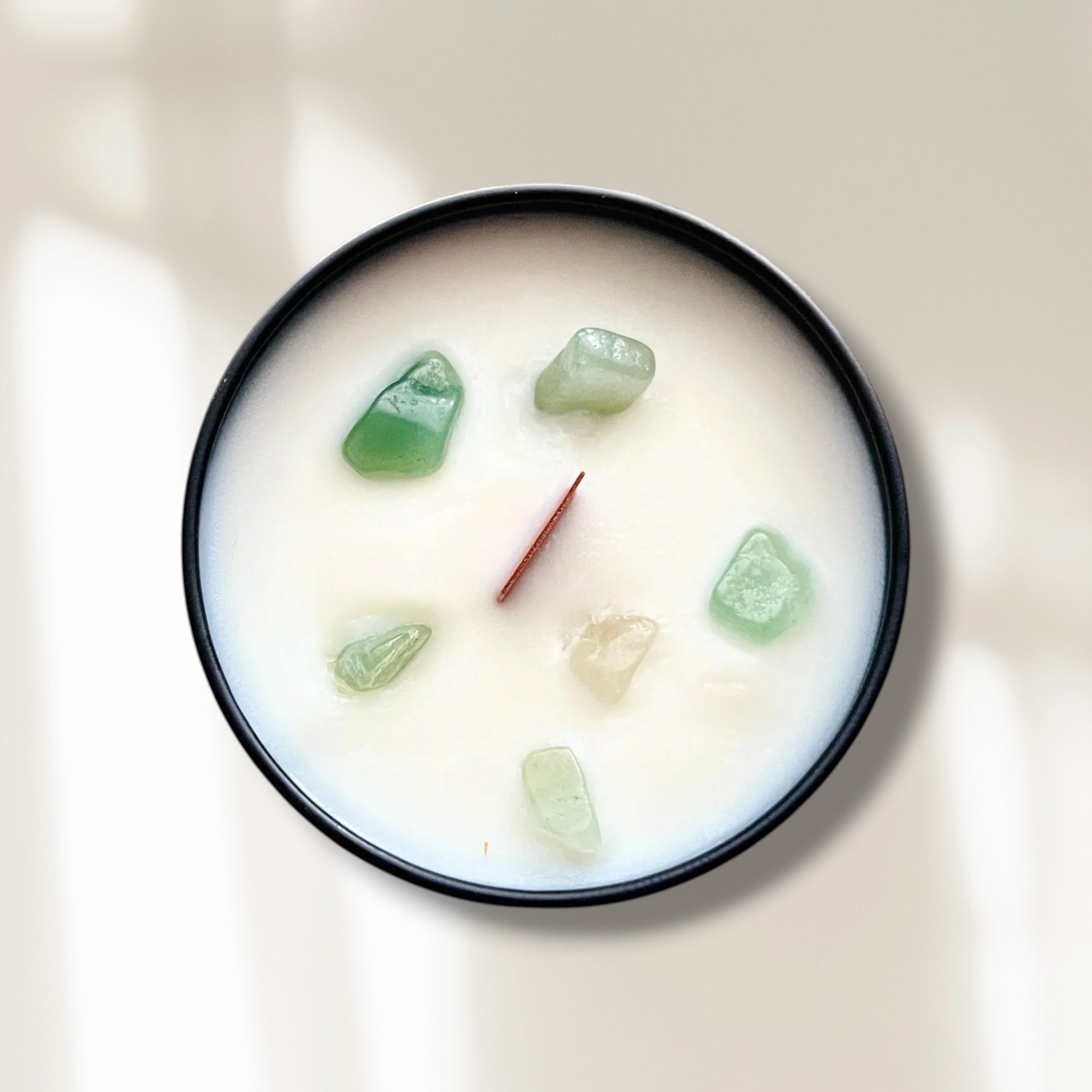 Immerse yourself in a serene atmosphere with this handcrafted candle. Sage , purifying and soothing, frees the mind from negative energies and promotes a peaceful ambiance, while aventurine , a stone of luck and prosperity, stimulates positivity and harmony. The candle burns for approximately 16 hours.