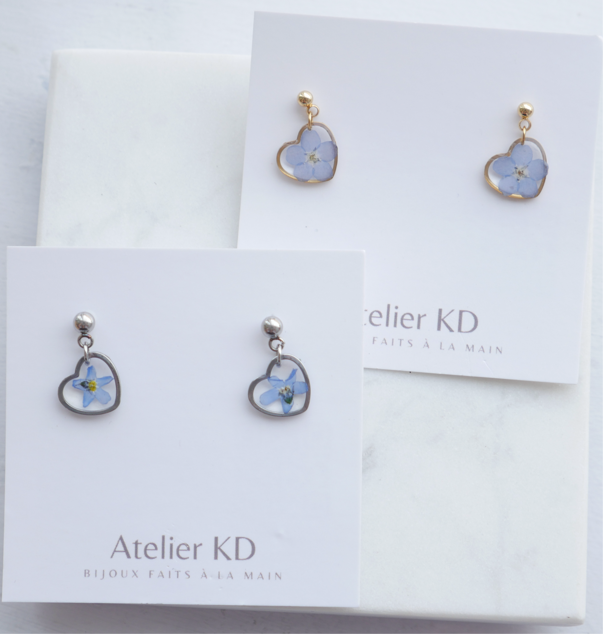 Mignonnes petites boucles d’oreilles en résine incrusté de fleurs de myosotis séchées.