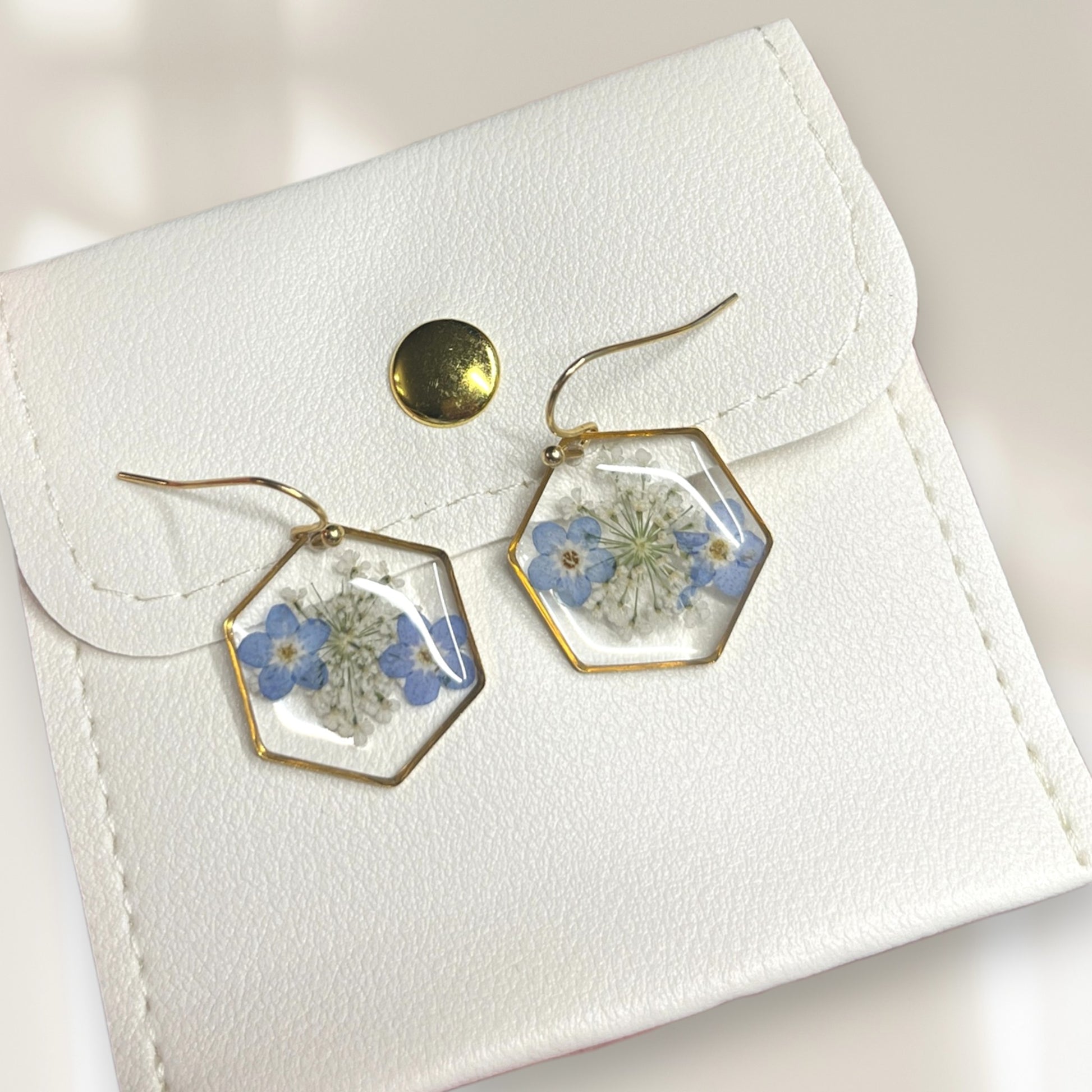 Magnifiques boucles d'oreilles pendantes en résine avec incrustations de vraies fleurs de myosotis d'environ 3 cm.