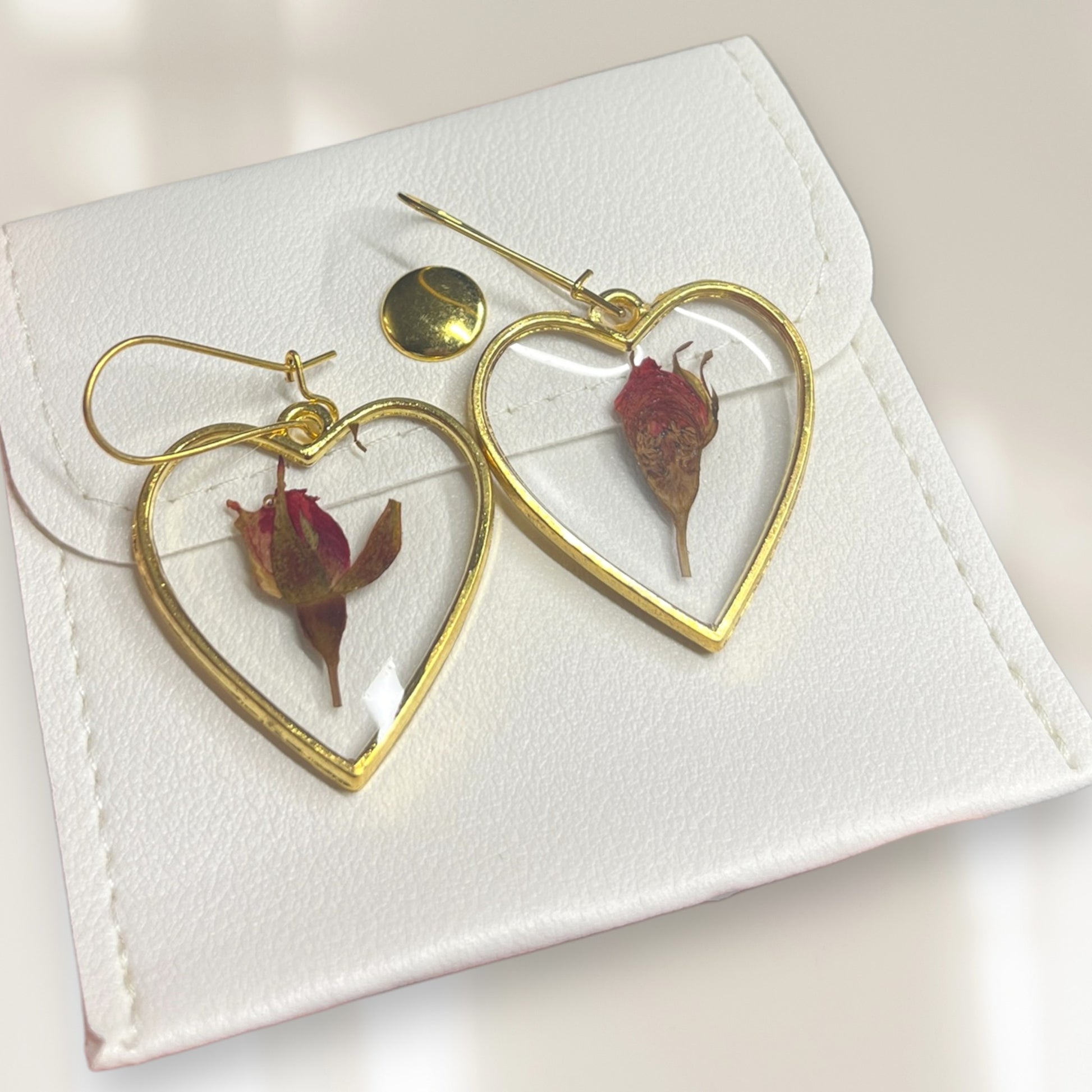 Magnifiques boucles d'oreilles pendantes en résine avec incrustations de boutons de roses d'environ 5 cm.